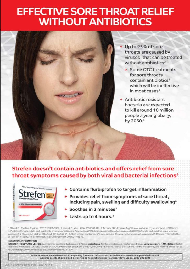 Our campaign focused on educating and increasing awareness in pharmacy on the overuse of antibiotics in sore throats and how Strefen provides an effective, antibiotic-free alternative. This tied in closely with Public Health England’s 2018 campaign ‘Keep Antibiotics Working’ and the judges recognised the close alignment and public health focus of the campaign.