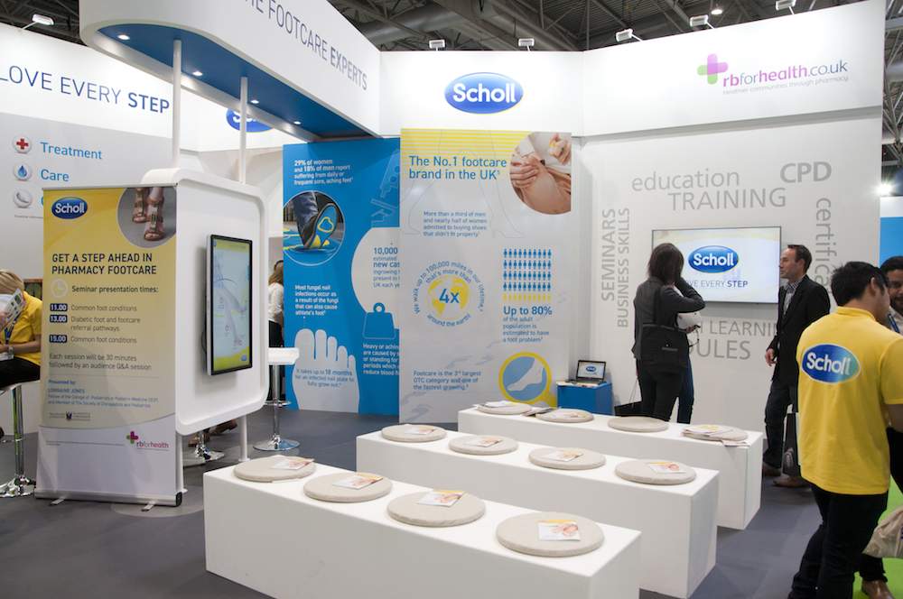 Scholl has bold and distinctive brand identity but we also wanted the design to retain a clinical and scientific feel to represent the depth of expertise and knowledge that comes with their footcare heritage. The physical size of the stand also gave us the opportunity to create ‘zones of interest’ to cover the extensive product range and key information about the most common foot conditions that pharmacy will be faced with everyday.